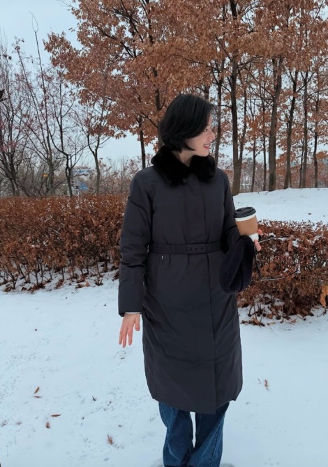 여배우 이지아가 입은 노비스 롱패딩은 슬림하고 고급스럽고 여성스러운 라인을